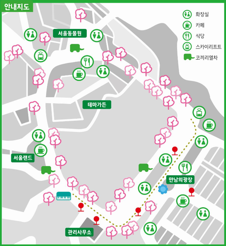 서울대공원 봄꽃축제는 서울대공원 일대에서 열리는 만큼 규모가 크죠. 서울대공원 안내지도에 화장실, 카페, 식당, 스카이리프트, 코끼리열차의 위치가 표시되어 있으니 똑똑하게 벚꽃축제 즐겨보세요!